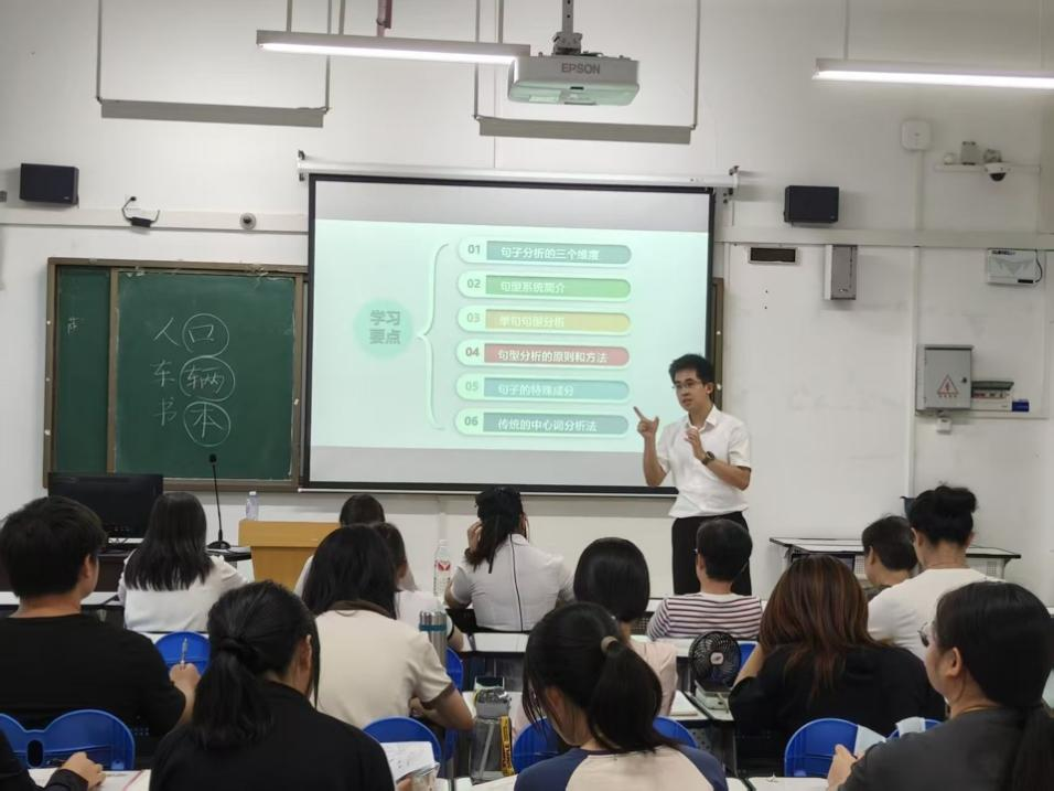 本次公开课分为教学示范和教研规划两个单元。旨在探索新文科背景下语言学课程的教学改革路径,重点展示知识图谱技术支持下的语法教学创新模式,同时明确语言学教研室将以本科导师制为纽带,打造“教、学、研、创、赛”协同机制,促进教师教改项目科研项目、学生双创课题的孵化与推进。在教学示范环节,刘基伟老师以其丰富的教学经验、生动有趣的教学方式,为现场的老师和同学们讲解了《现代汉语》语法部分的精彩内容。在授课过程中,他通过平行语料库对比分析汉英句法结构的类型差异,用形象直观的范例对比,介绍了在语言表达上现代汉语普通话与英语的差异,以及古汉对比、中西对比的学习与研究方法。在教研规划环节,刘基伟老师介绍了教研室的联合本科导师制、教研室学习小组的学习模式,公布了2025年度后续教研活动——AI技术应用培训、普通话培训、语言文字调查培训等,并鼓励同学们积极参与。