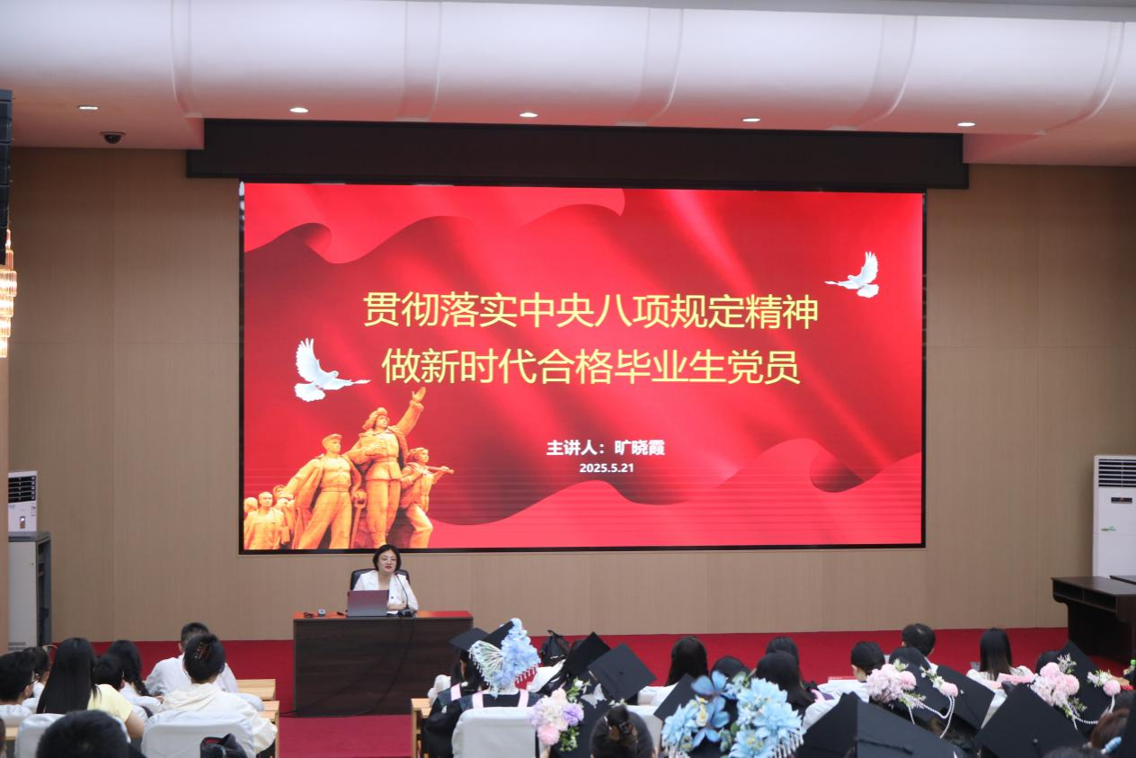 旷晓霞书记以《贯彻落实中央八项规定精神,做新时代合格毕业生党员》为题讲授党课。首先,围绕中央八项规定精神的概念内涵、出台背景意义及违反中央八项规定精神的行为表现,对这堂党员人生的“终身必修课”进行阐释讲解。其次,带领与会人员共同学习了2025年新修订《厉行节约反对浪费条例》要点,指出强化厉行勤俭节约、反对铺张浪费,对于深入贯彻中央八项规定精神、持续深化纠治“四风”具有重要意义。最后,将反面示警与正向引导相结合,开展了典型案例分析,要求毕业生党员步入社会后持续贯彻 落实中央八项规定精神,做到与职业发展结合、与社会交往结合、与家庭生活结合。