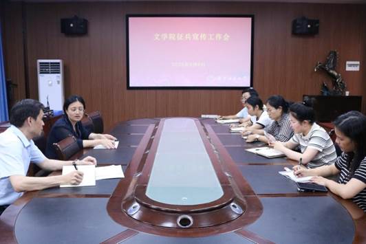 为积极响应国家征兵号召,扎实推进2025年春季征兵工作,2025年5月6日上午,文学院在理科综合楼404会议室举行征兵宣传工作会。文学院党委副书记吴幼坚主持会议并作具体部署,党委书记旷晓霞,各年级辅导员参加会议。