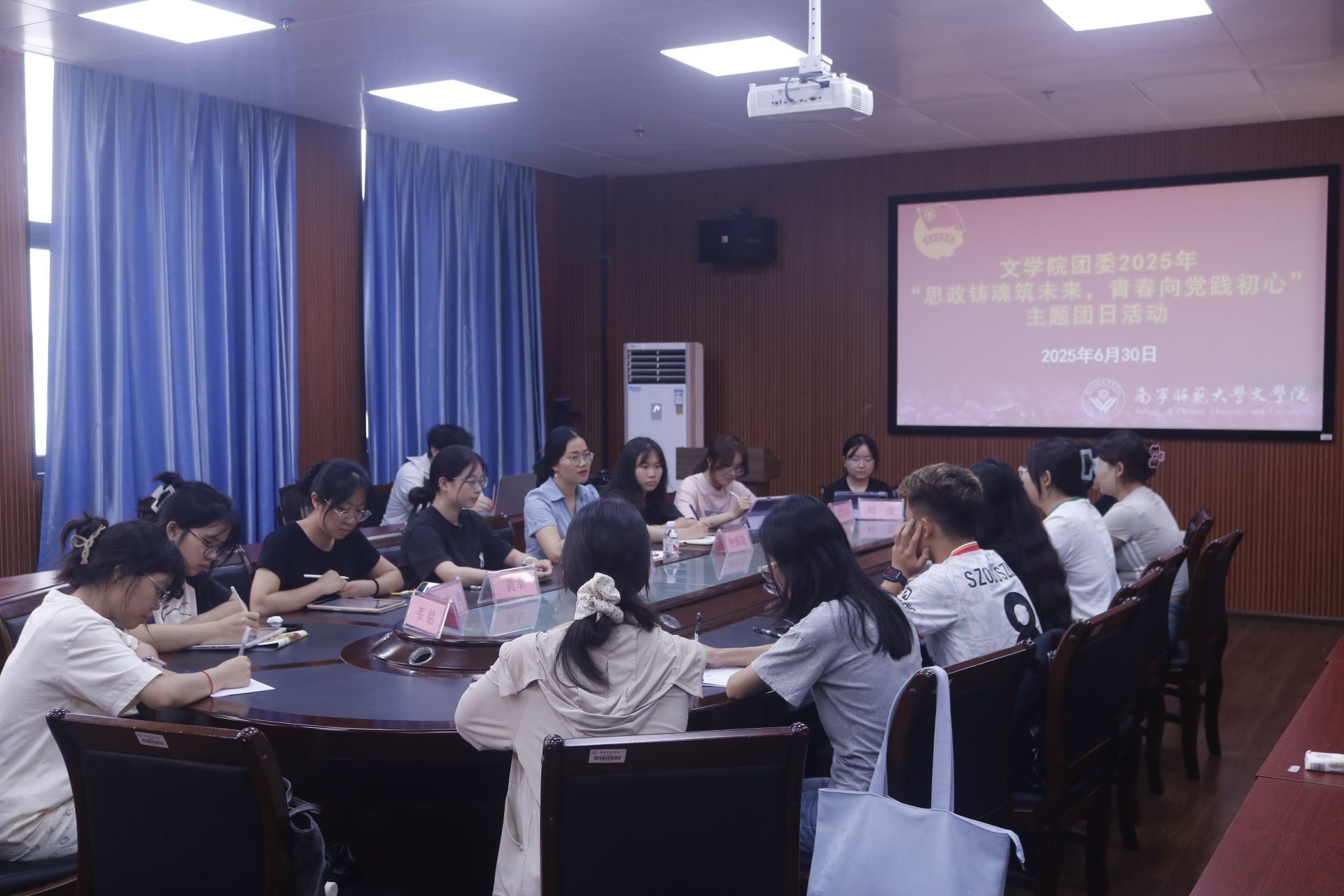 为持续深化青年思想政治引领,筑牢团员青年理想信念根基。6月30日,文学院团委在理综楼404会议室举办“思政铸魂筑未来,青春向党践初心”主题团日活动。文学院团委书记钟振花老师及各班团支书参加此次活动。