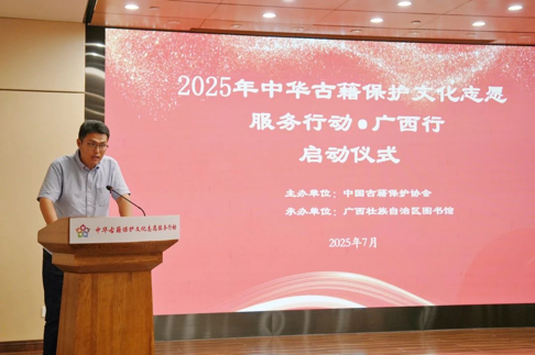 7月8日,由中国古籍保护协会主办的“2025年中华古籍保护文化志愿服务行动·广西行”在广西壮族自治区图书馆正式启动。中国古籍保护协会秘书长吴凯、广西壮族自治区图书馆馆长秦小燕等领导出席启动仪式,来自广西大学、广西民族大学、betway必威西汉姆联官网等高校的志愿者代表以及相关工作人员共50余人参加活动。作为国家级古籍保护品牌活动,该行动旨在动员青年力量参与中华文化遗产传承,对推动古籍保护与传统文化传承具有重要意义。