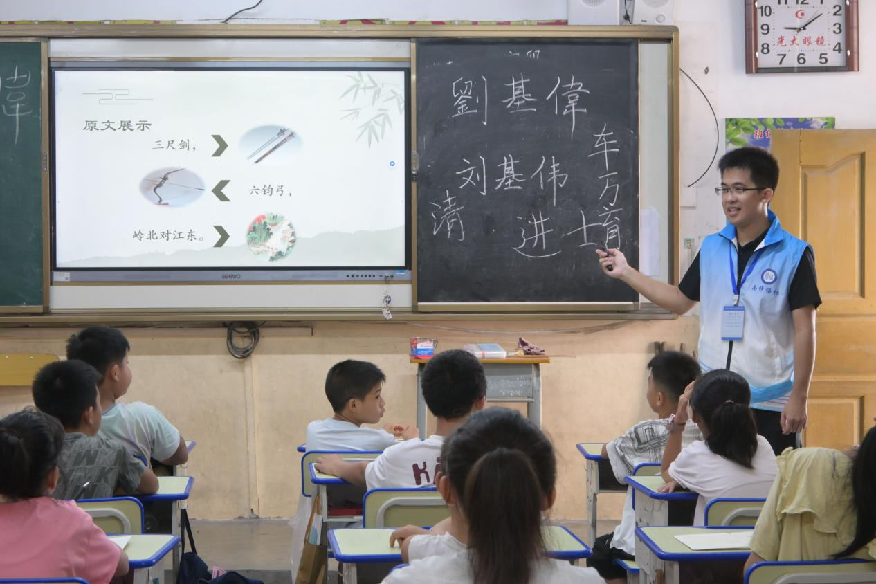 7月18日,为响应国家乡村教育振兴号召,加强农村地区文化建设,推广国家通用语言文字,南宁师范大学语言文学工作委员会副主任胡惠老师以及betway必威西汉姆联官网文学院“星火”推普助力乡村振兴服务团的两位带队教师专任教师刘基伟和文学院团委书记钟振花三位老师走进龙岸镇中心小学的课堂,开展了一场意义非凡的“三下乡”送教活动。