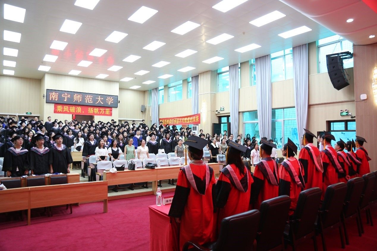 毕业生代表在发言中,分享了自己在文学院的成长历程和收获。从初入校园时的懵懂青涩,到如今即将踏上新征程的自信坚定,这一路充满了欢笑与泪水,也凝聚着老师们的辛勤付出和同学们的相互支持。他们表达了对学院和老师们的感恩之情,并表示将带着文学院的教诲和期望,在未来的工作和生活中,践行 “德才并育,知行合一” 的校训,努力拼搏,为母校争光。