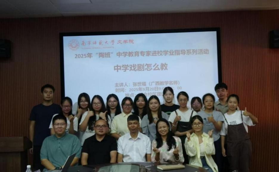 为贯彻落实《汉语言文学专业陶行知实验班2025年建设方案》中“强化实践教学、深化校地协同育人”的精神,进一步提升学生的中学语文教学实操能力,9月20日上午,文学院在理综418教室举办了首场“中学语文教学实操指导活动”。广西教学名师张世福老师受邀莅临文学院,陶班负责人王毅老师、语文课程与教学论教研室陈亚飞老师,学院2023级陶班学生、2024级学科语文研究生和2025级学科语文研究生参与活动。