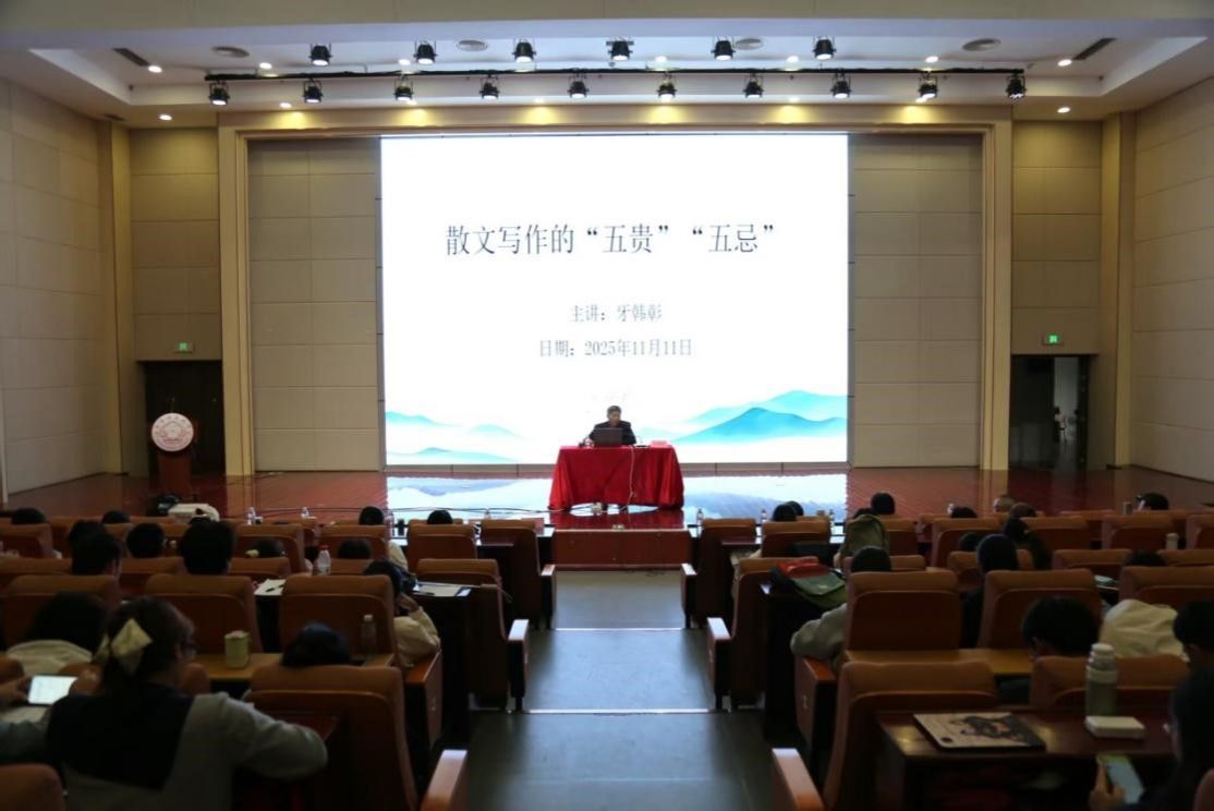 讲座中,牙韩彰老师结合自身丰富的创作与编辑经验,深入阐释了散文写作的“五贵”,即贵在真情、贵在个性、贵在细节、贵在留白、贵在质朴,强调散文应以真实情感为基石,展现新颖视角、深刻内涵和灵动表达;同时,他点明了“五忌”,即忌虚饰拔高、忌套路化表达、忌辞藻堆砌、忌主题模糊、忌脱离生活,提醒写作者避免内容空洞、形式老套等问题。这“五贵五忌”的剖析,精准地为在场师生梳理了散文写作的优劣要点。