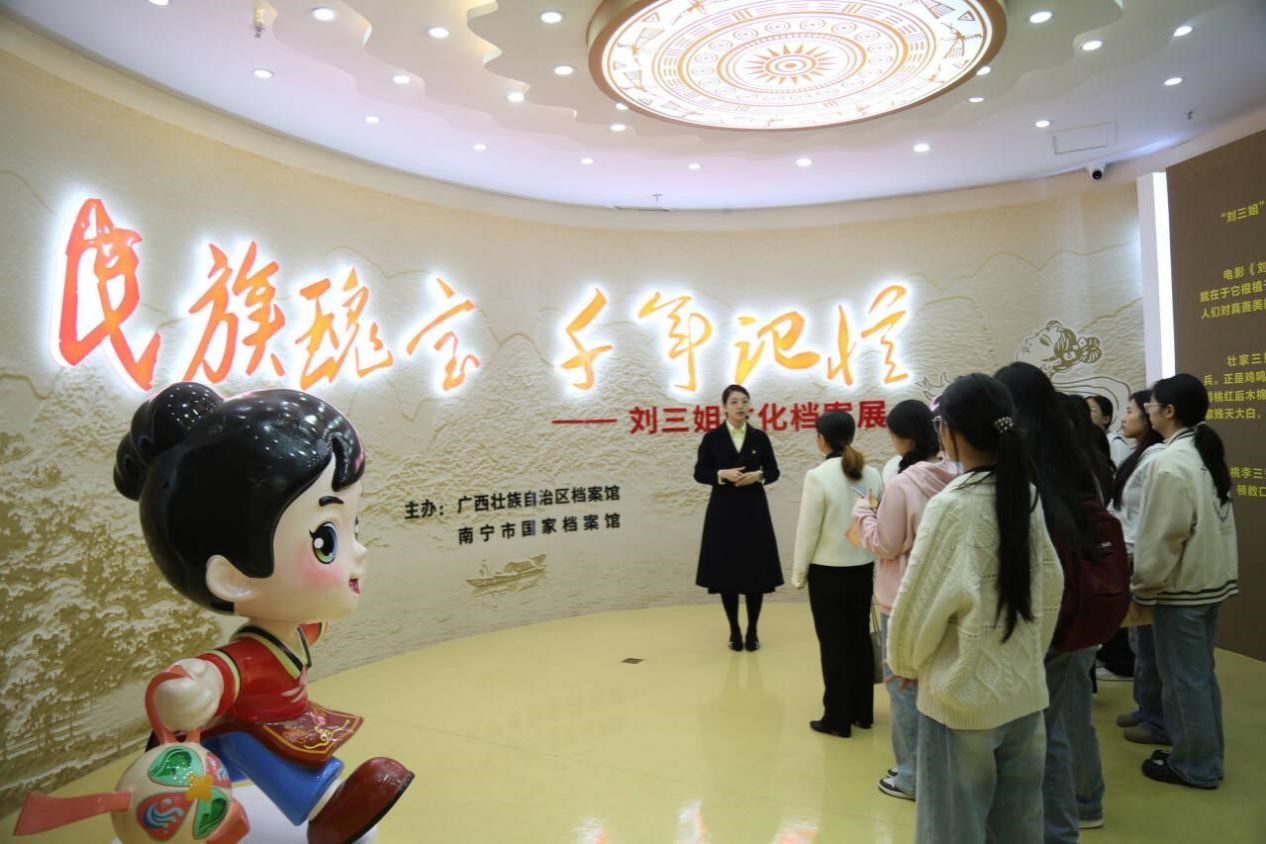 随后,一行人前往“民族瑰宝,千年记忆——刘三姐文化档案展”。展览以丰富的图文、影像及实物档案,系统展现了刘三姐文化源远流长的发展历史及其蕴含的多民族交融共生特质。文学院师生立足中国语言文学的学科视角,深入探讨了这一文化符号在增强文化认同、促进民族团结、铸牢中华民族共同体意识方面的重要作用。
