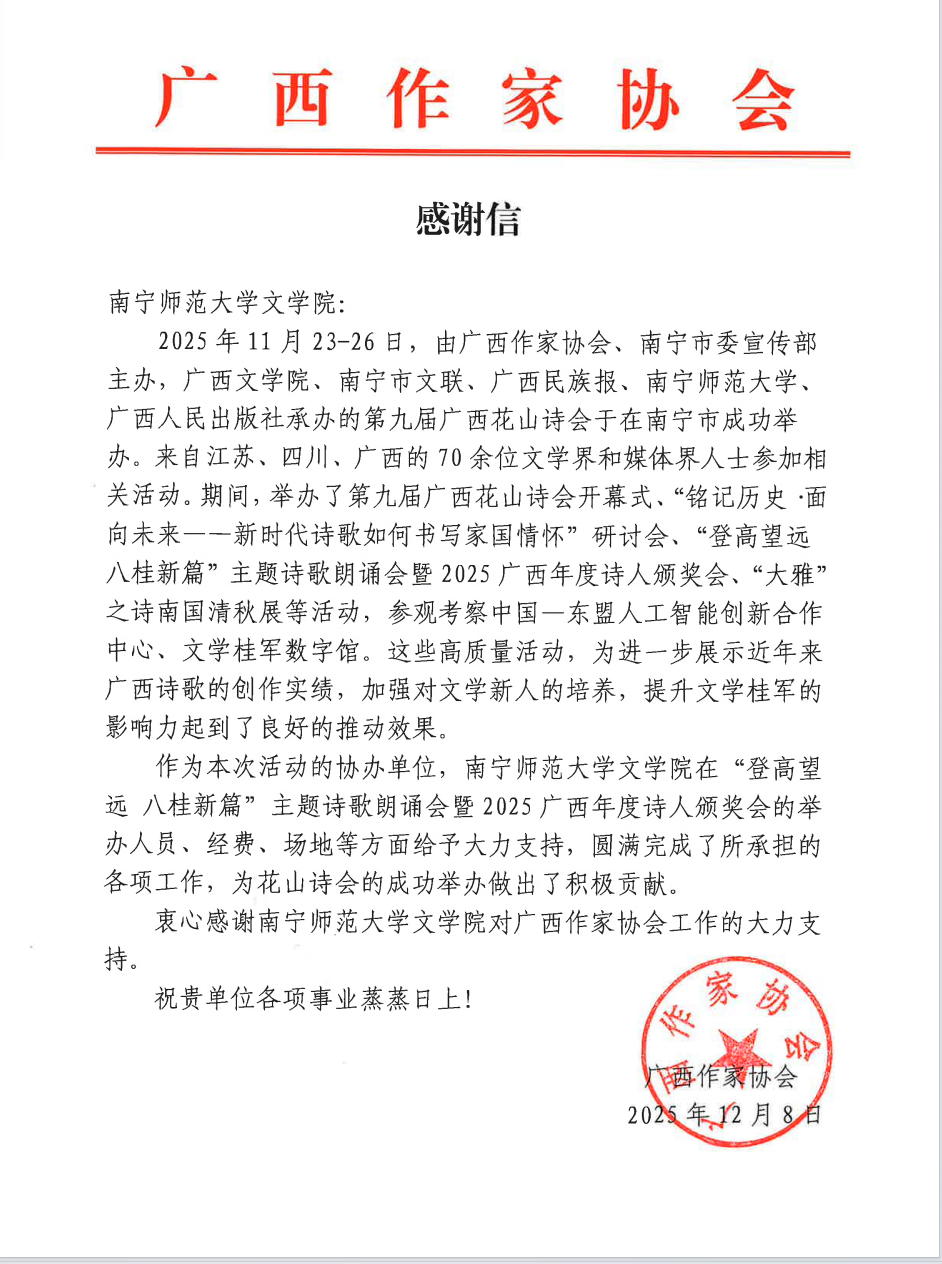 2025年11月23-26日,由广西作家协会、南宁市委宣传部主办,广西文学院、南宁市文联、广西民族报、betway必威西汉姆联官网、广西人民出版社承办的第九届广西花山诗会于在南宁市成功举办。来自江苏、四川、广西的 70余位文学界和媒体界人士参加相关活动。期间,举办了第九届广西花山诗会开幕式、"铭记历史·面向未来﹣﹣新时代诗歌如何书写家国情怀"研讨会、"登高望远八桂新篇"主题诗歌朗诵会暨2025广西年度诗人颁奖会、"大雅"之诗南国清秋展等活动,参观考察中国一东盟人工智能创新合作中心、文学桂军数字馆。这些高质量活动,为进一步展示近年来广西诗歌的创作实绩,加强对文学新人的培养,提升文学桂军的影响力起到了良好的推动效果。