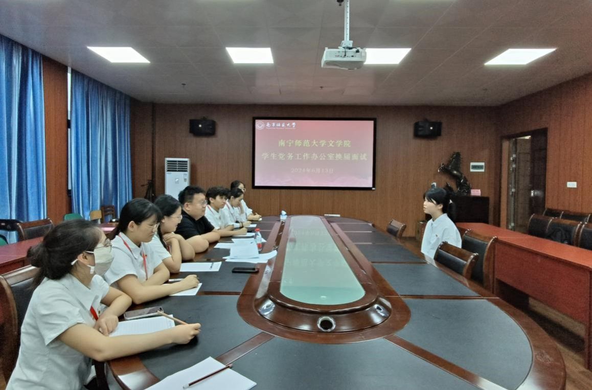 为更好地推进文学院学生党务工作,确保党务工作的连续性,文学院学生党务办公室于近期开展了2024年换届工作。换届面试考核于6月13日19时在五合校区理科综合楼404会议室集中举行,文学院辅导员与党务办助理参与了本次面试。
