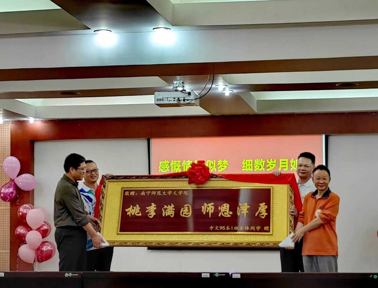 会上,校友向培育自己成长的文学院敬赠“桃李满园,师恩泽厚”牌匾并向参加座谈会的全体老师行谢恩仪式。北部湾高中的语文特级教师、正高级教师龙明洲代表全班同学做了题为《二十五载重聚首,母校恩情永存心》的主题发言,班主任宾恩海教授做了“我们一起向青春致敬”的主旨发言,校友们在现场再次聆听了大学恩师的教诲。每一位同学也情不自禁地分别向母校领导和老师汇报自己二十多年的工作业绩,大家感念学生时代的文学生活和为理想而充满激情去奋斗的美好往事,流露出对恩师的牵挂与感激,真切表达对母校的感恩与祝福。