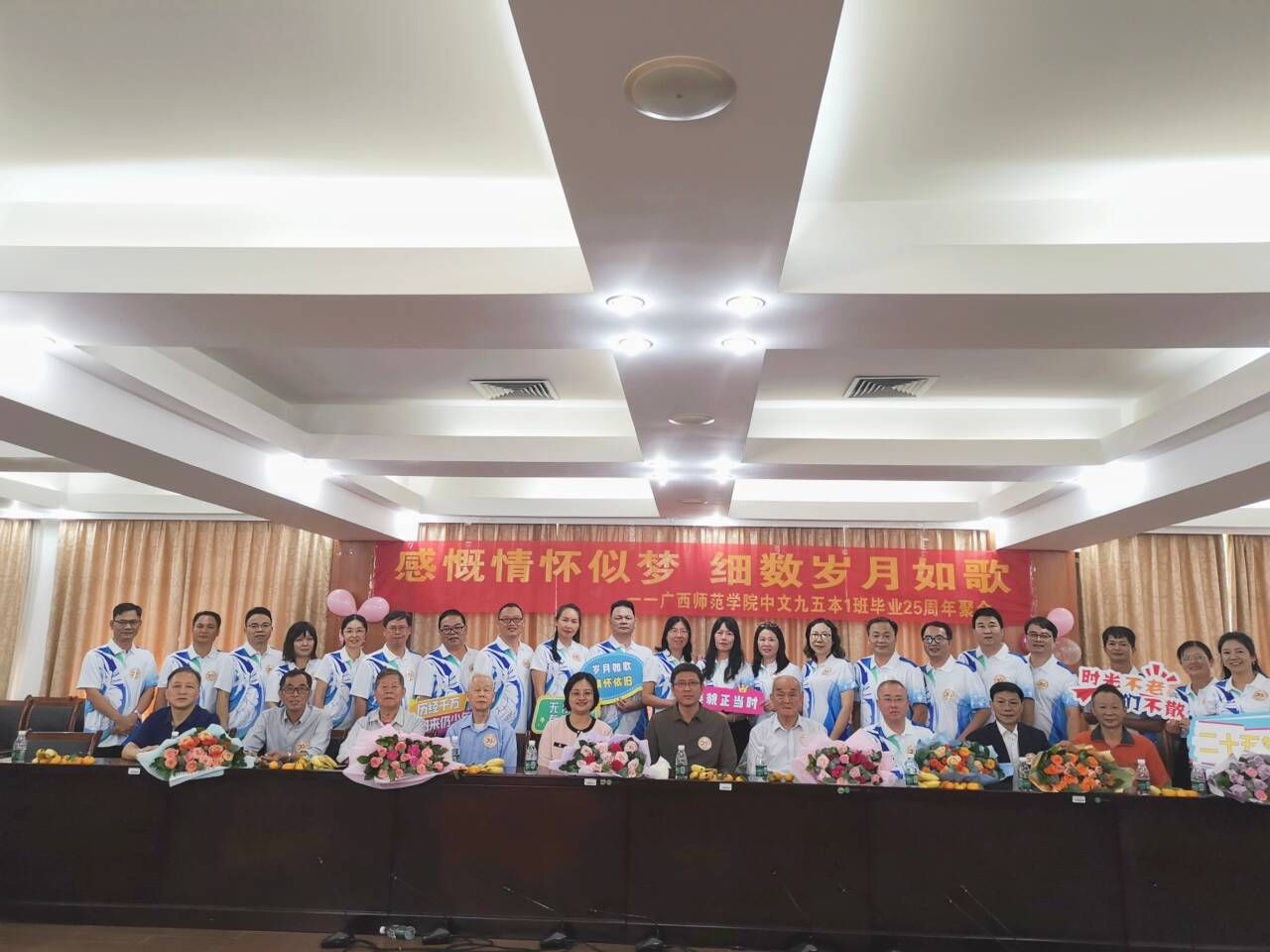 10月26日上午,betway必威西汉姆联官网中文系95级本科1班同学回到母校,在他们当年发奋读书、青春有为的明秀校区鸿远楼409会议室隆重举行以“感慨情怀似梦,细数岁月如歌”为主题的毕业25周年纪念活动。文学院党委书记旷晓霞、院长石勇和当年专业授课教师江业国教授、吴隐林教授、王光荣教授、施平教授、李福灼教授、宾恩海教授、李志元教授、何玉嘉老师等应邀参加座谈会。座谈会由该班班长、我校来宾校友办常务副主任、柳州地区民族高级中学党委书记邓东锋主持。