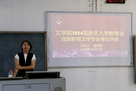 在戏剧影视文学专业导论会上,潘怿晗老师向同学们介绍了戏剧影视文学专业的基本情况、培养方案以及学科的发展展望。她表示,随着时代发展,戏剧影视文学在不同的行业中扮演着越来越重要的角色,希望同学们把握好发展机遇,既要加强学科素养,又要通过理论学习与创新实践提高能力素养。