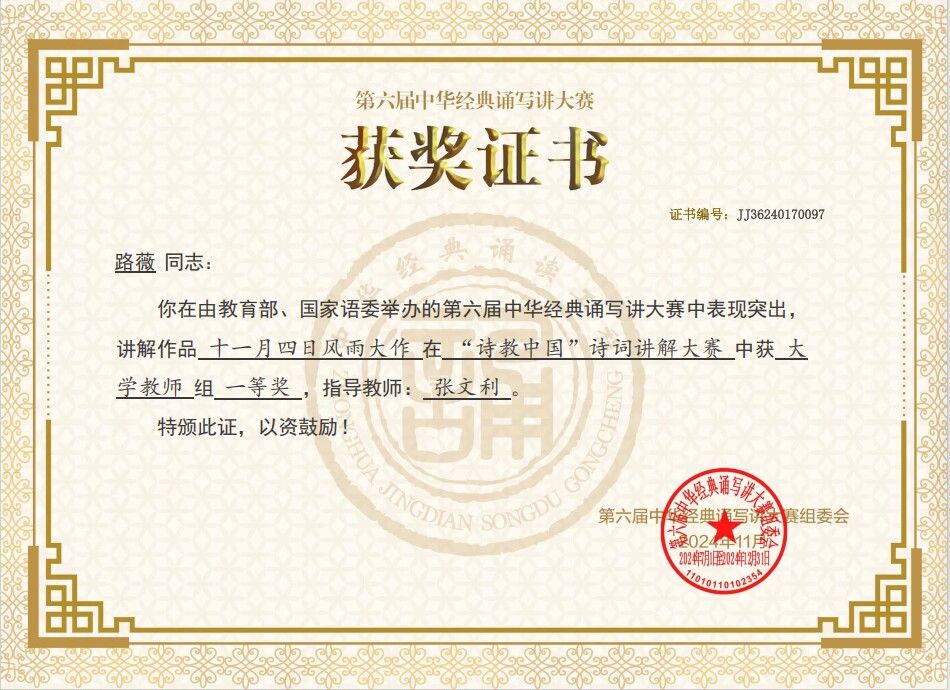近日,由教育部、国家语委共同主办的第六届中华经典诵写讲大赛全国总决赛获奖名单公布,我校文学院教师路薇在大赛中表现突出,讲解作品《十一月四日风雨大作》在“诗教中国”诗词讲解大赛全国总决赛中荣获大学教师组一等奖。