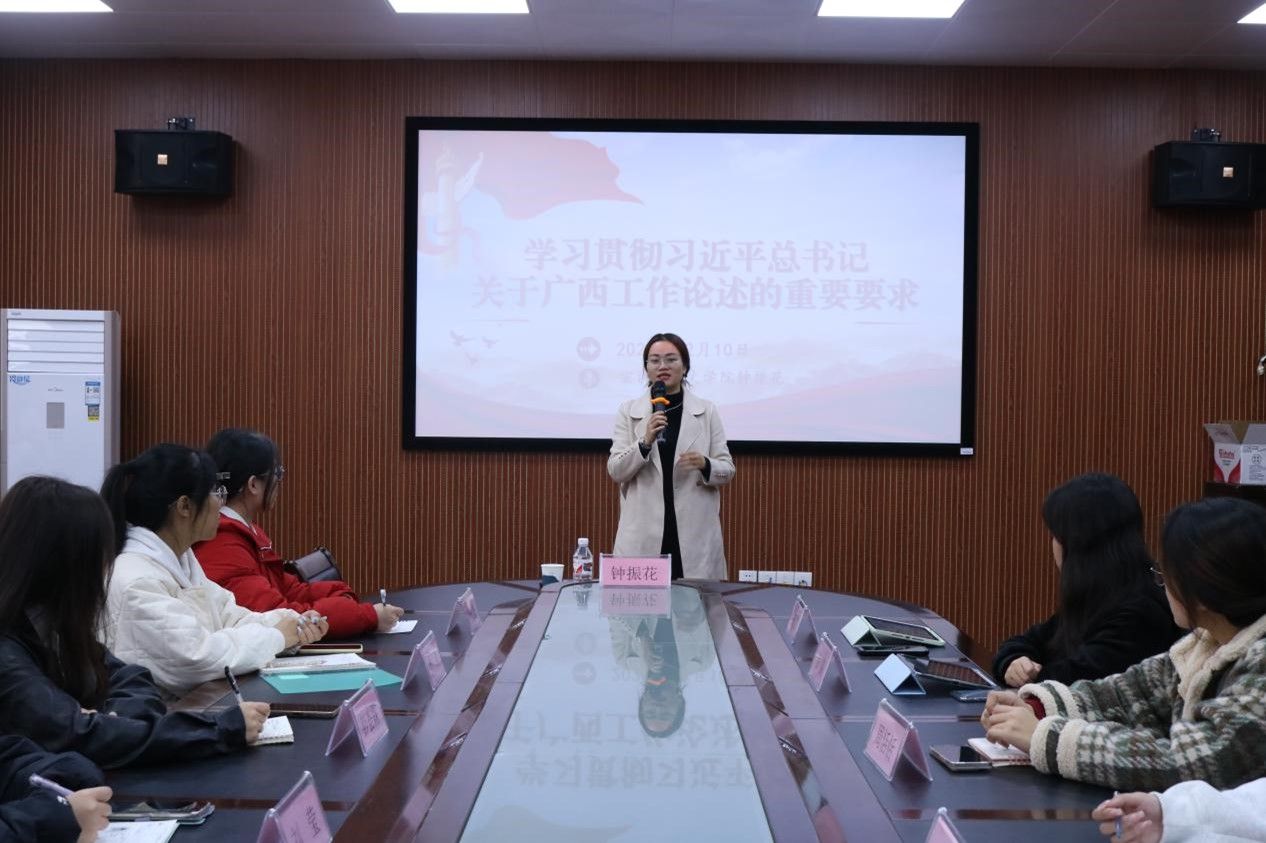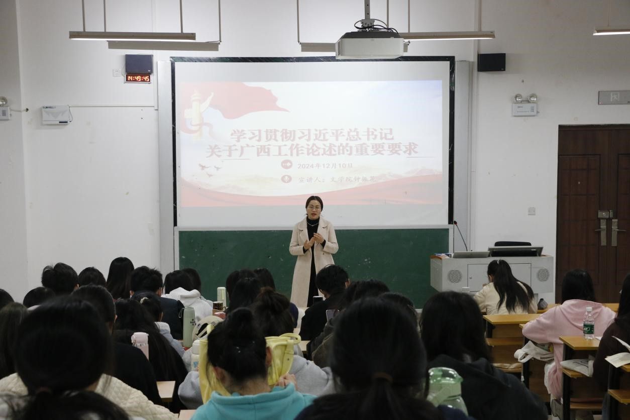 为深入学习贯彻习近平总书记关于广西工作论述的重要要求,铸牢中华民族共同体意识,助力谱写中国式现代化广西篇章,12月10日,文学院分别于理科综合楼404会议室、文科综合楼1013教室开展“关于深入学习贯彻习近平总书记关于广西工作论述的重要要求”专题宣讲会,宣讲人为文学院团委书记钟振花,团委学生会学生干部代表及23级学生代表参会。