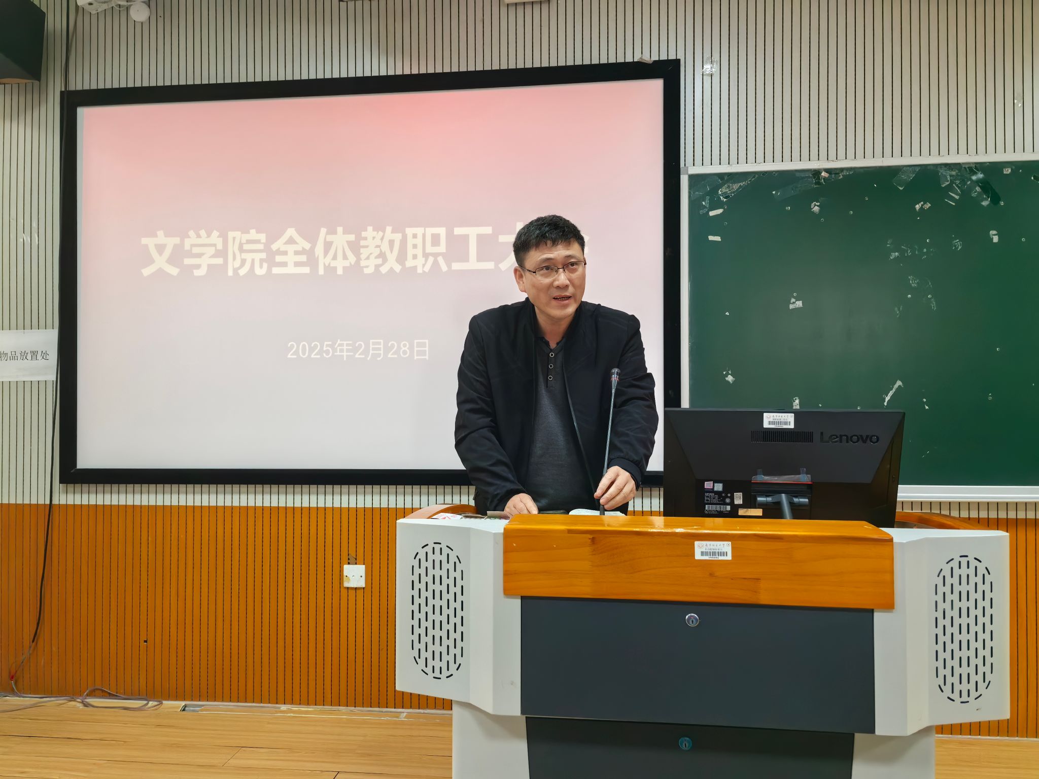 2025年2月28日,文学院召开新学期全体教职工大会,部署新学年重点工作任务,凝心聚力开新局。学院党委书记旷晓霞,院长石勇,党委副书记吴幼坚,副院长林安宁出席会议并就相关工作进行总结布置,全体教职工参会。