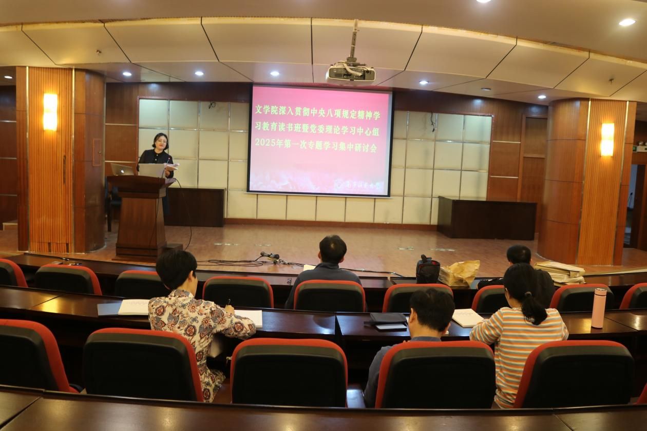 3月28日,文学院党委深入贯彻中央八项规定精神学习教育读书班暨学院党委理论学习中心组2025年第一次专题学习集中研讨会在明秀校区召开。文学院党委书记旷晓霞主持会议,学院领导班子、党委委员及教职工代表参加会议。