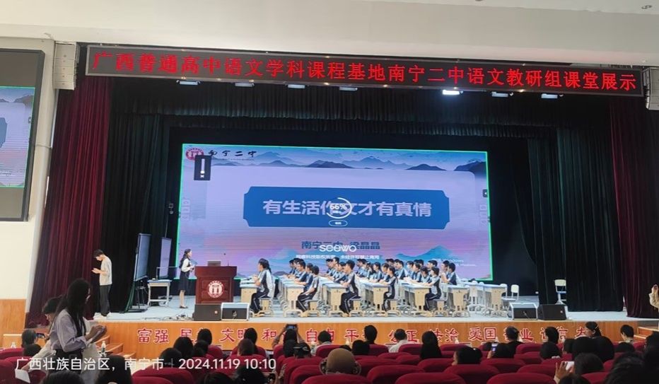 随后,师生共同观摩了由南宁市第二中学梁晶晶老师执教的《有生活作文才有真情》和覃莹莹老师执教的《有思考作文才有思想》两节课。梁晶晶老师从同学们的写作困惑出发,一步步引导同学们感悟生活,写出带有真情实感的文章。覃莹莹老师则从“沉香与木炭”材料出发,启发学生理解生活中的“沉香”、“木炭”,并引发学生对愿意做“沉香”还是愿意做“木炭”的思考,从而面对新的作文题目可以很好地建构自己的行文思路。