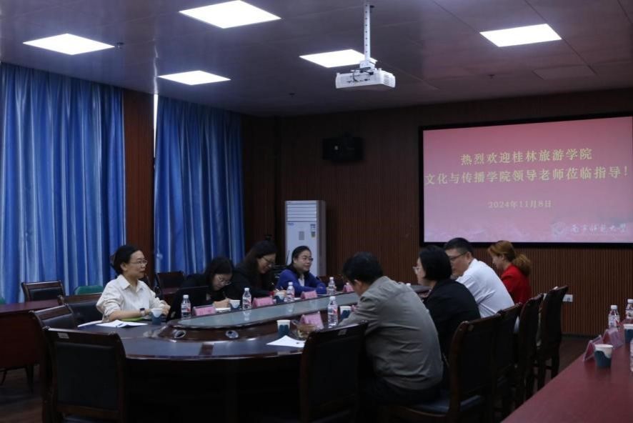 为加强两院之间的学术合作,共同探讨专业建设、教学实践、科研服务等领域的创新与发展,11月8日上午,桂林旅游学院文化与传播学院院长刘爱萍、副院长谢金娇、汉语国际教育教研室主任白雪、汉语言文学教研室主任李钰等一行4人到我校文学院进行座谈交流。文学院党委书记旷晓霞、院长石勇、副院长林安宁、中国现当代文学教研室主任王俊、语言学教研室主任韦露选等人热情接待了刘爱萍一行,文学院全体行政人员陪同调研交流。