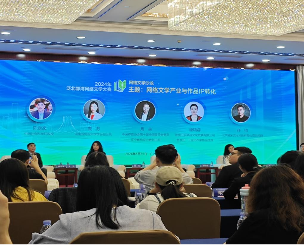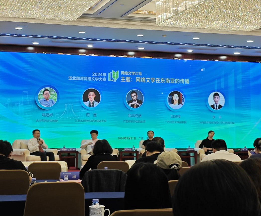 2024年5月31日上午,为激发同学们对文学作品创作的热爱,提高自身文学素养,促进学生写作综合素养达成,感受网络文学的独特魅力,文学院受广西人民出版社邀请参加2023年泛北部湾网络文学大赛颁奖暨2024年泛北部湾网络文学大赛启动仪式。本次活动由广西壮族自治区新闻出版局、云南省新闻出版局、海南省新闻出版局、广西壮族自治区互联网信息办公室、广西壮族自治区文学艺术界联合会、广西出版传媒集团有限公司主办,参加此次活动的有区级领导、专家代表、企业代表、网络作家代表、媒体代表等,还有各高校的领导、专家和文学院20余名学生代表。