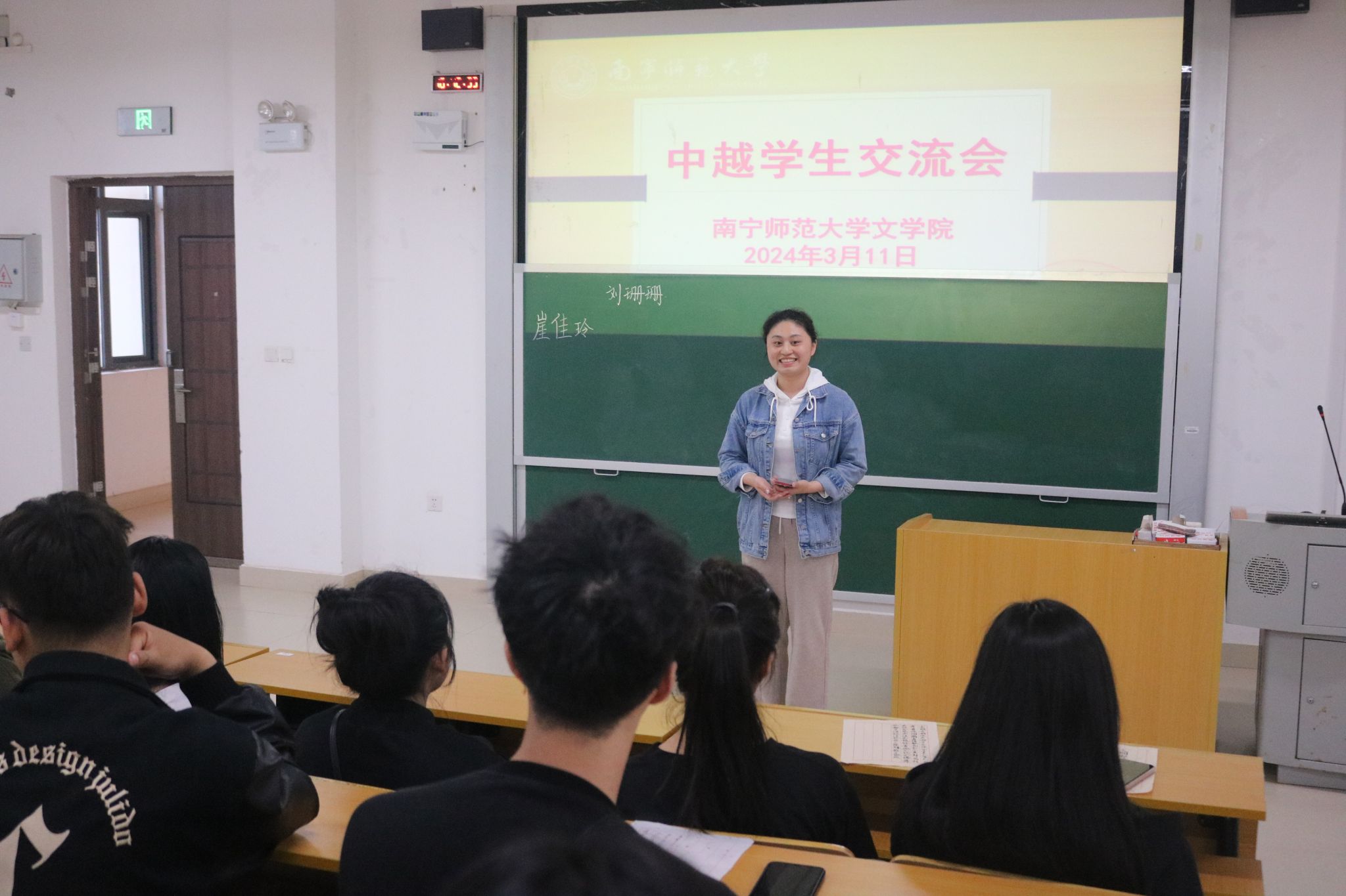 交流会上,文学院学生干部崖佳玲向越南朋友介绍了学院大致情况,举办的系列活动、经典比赛等,为大家播放了由文学院承办的校级课本剧大赛中的《秋瑾》片段,并表示后续的各种活动热烈欢迎越南同学们的参与。同学们一一介绍自己的基本情况、家乡美食、兴趣爱好等,带动越南部分同学也参与自我介绍的队伍中。中越学生在一阵阵欢声笑语中互相认识,现场交流互动进展顺利,气氛和谐融洽。