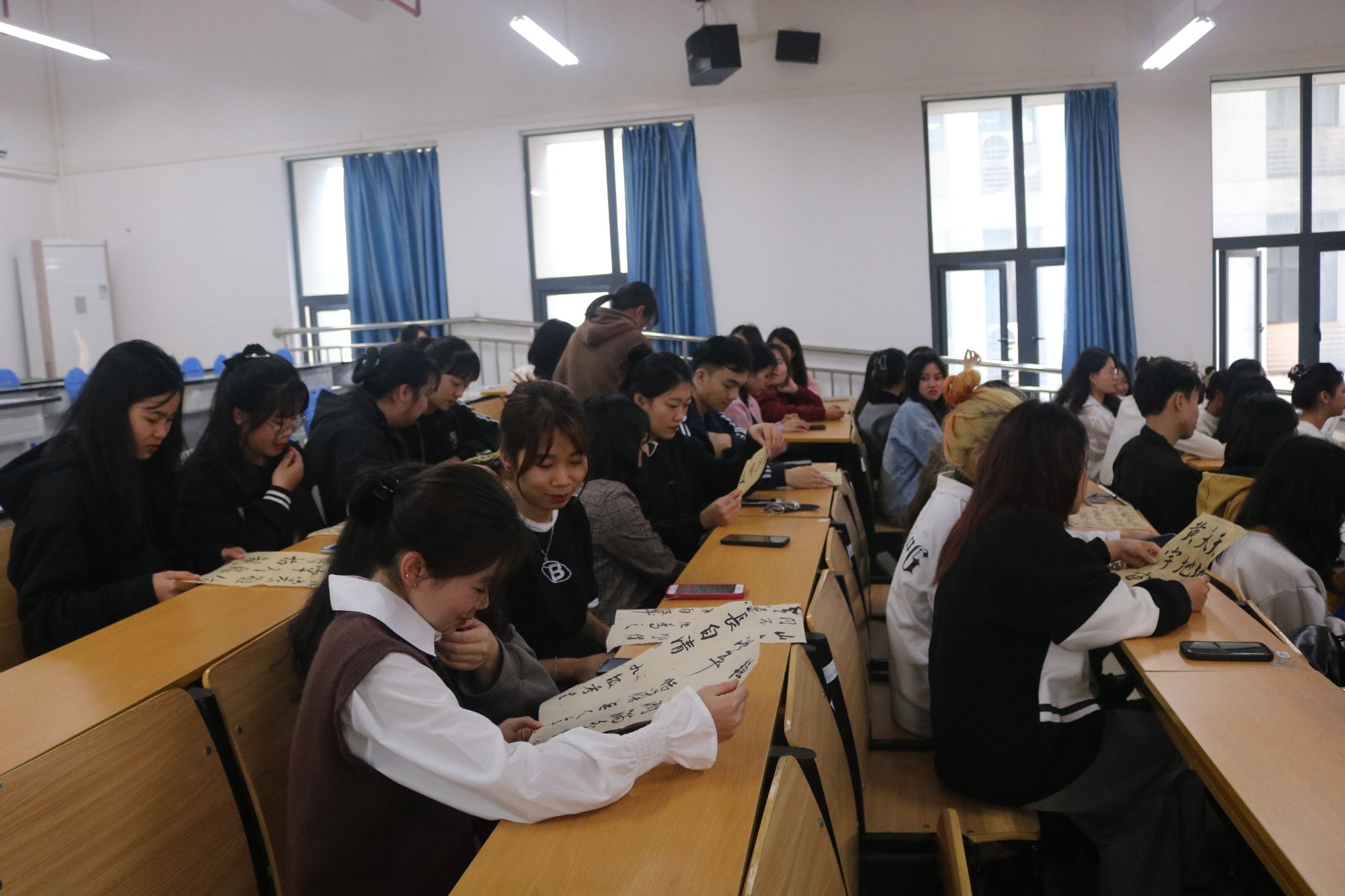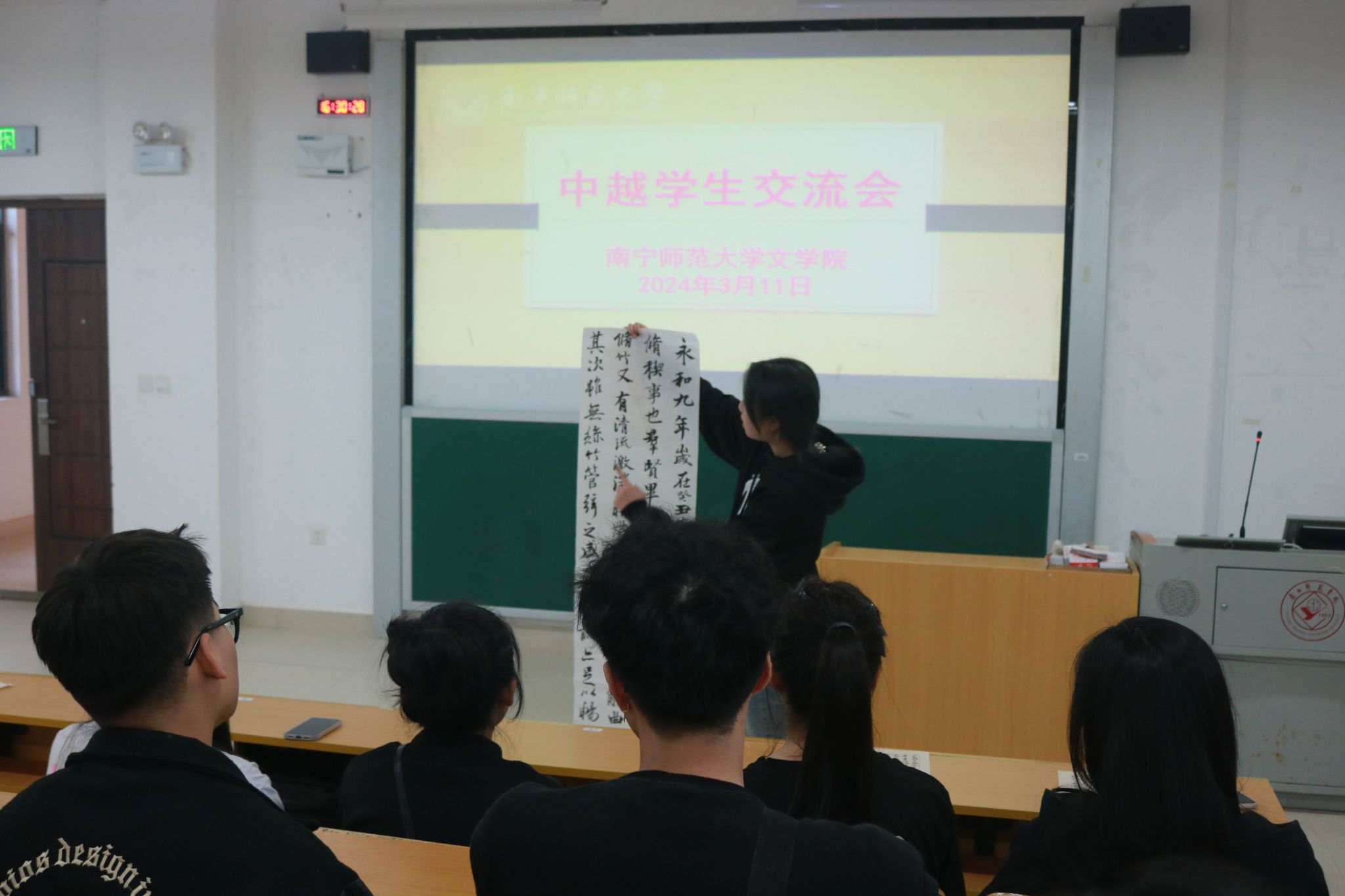 此外,文学院学生在交流会现场向越南朋友发放由学院学生书写的毛笔字,胡语同学介绍了中国书法遵循从右往左写的规律,以其中一篇书法作品《赤壁赋》讲解了中国古代文人墨客的潇洒与自由,同时也向大家展示了中华汉字的独特魅力。