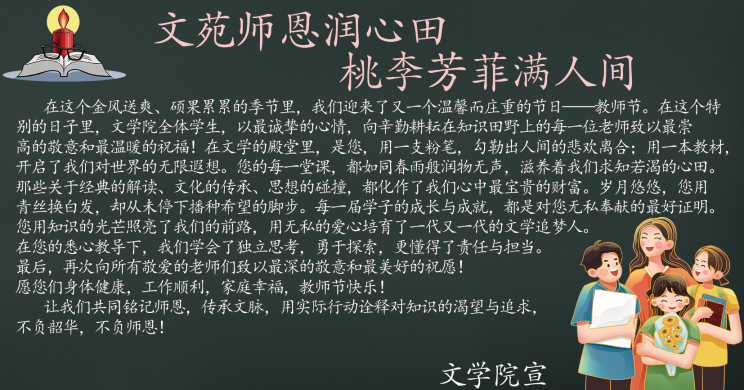 为表达对教师们的敬意,文学院于9月9日进行“文苑师恩润心田,桃李芳菲满人间”主题的黑板报绘制工作。