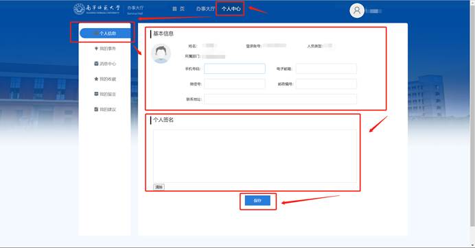 点击个人中心按钮,跳转到个人中心界面,在个人信息界面可以对账户的基本信息进行修改,也可定制个人签名,点击保存按钮即可将修改好的信息保存在个人信息内。