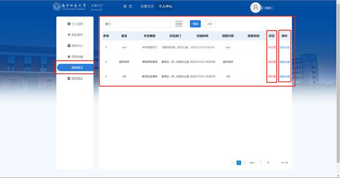 点击我的留言按钮,在我的留言界面,快速查看服务办理时留言的处理状态,和留言详情