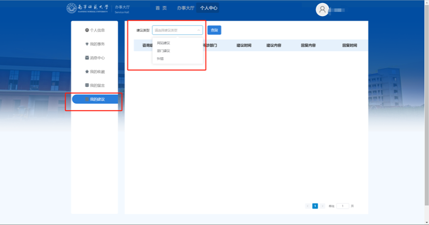 点击我的建议按钮,在我的建议界面,通过建议类型查看用户个人提出的建议,以及建议的回复